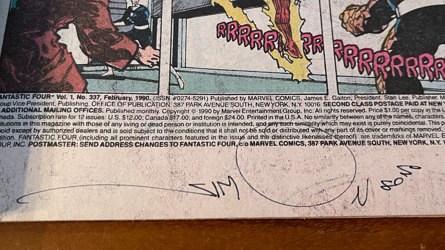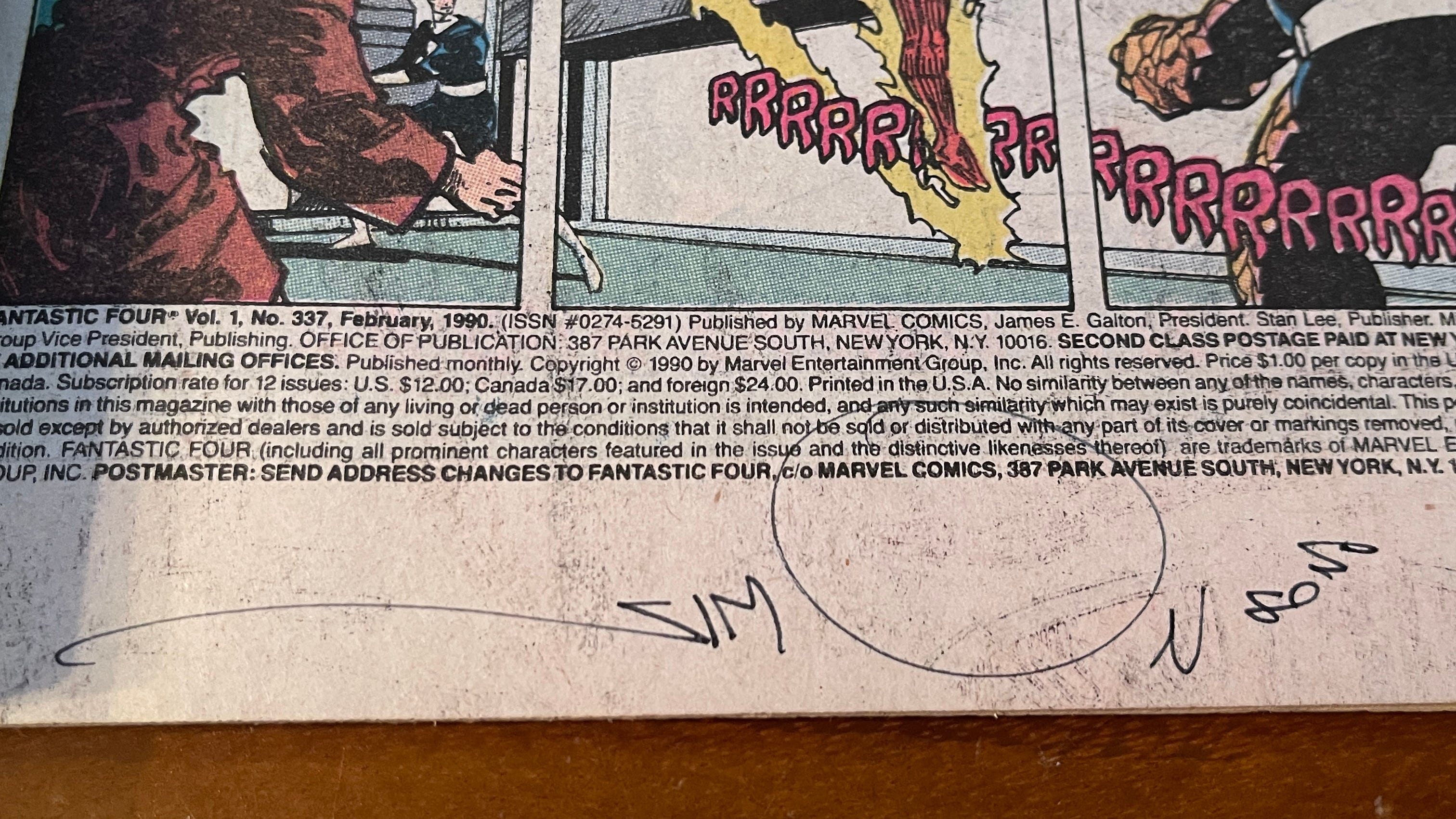 My favorite personal signature is on Fantastic Four # 337. Walt and Weezie Simonson were two of my favorite comics creators back in 1990. He had already had made Thor one of the best comic runs ever produced, and at that time he was writing and drawing the first family of Marvel Comics.