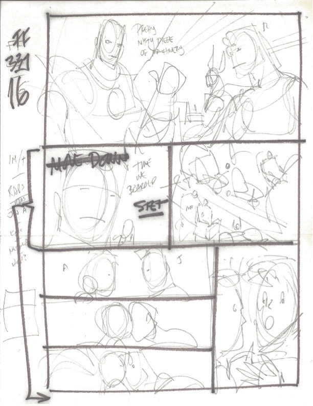 We had a copy of FF 337, and Walt pulled out the thumbnail pages for the issue. For those that may not know, thumbnails are a critical piece of the storytelling machine that eventually becomes a comic book. They hold key pieces or milestones for the comic, and they lay out the structure of every panel on every page. The artist then has them as a map to eventually turn into finished pencils and inks.
